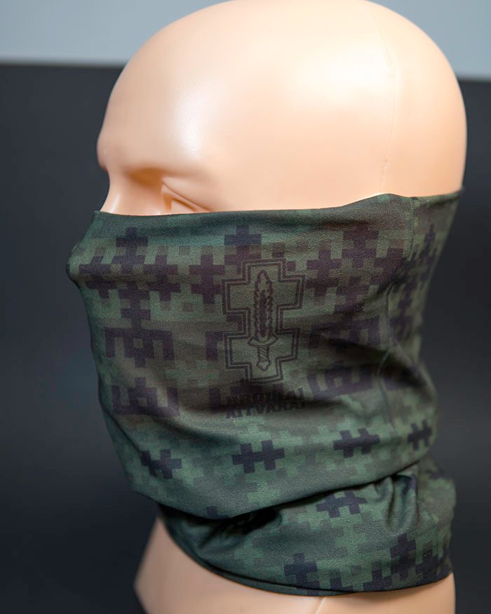 Žalios spalvos kamufliažo dizainas puikiai dera prie gamtos aplinkos ir suteikia subtilų, bet išskirtinį stilių. Kaklaskarė gali būti dėvima įvairiais būdais – kaip kaklo mova, veido kaukė, galvos juosta ar kepurė.