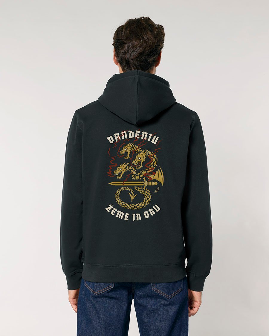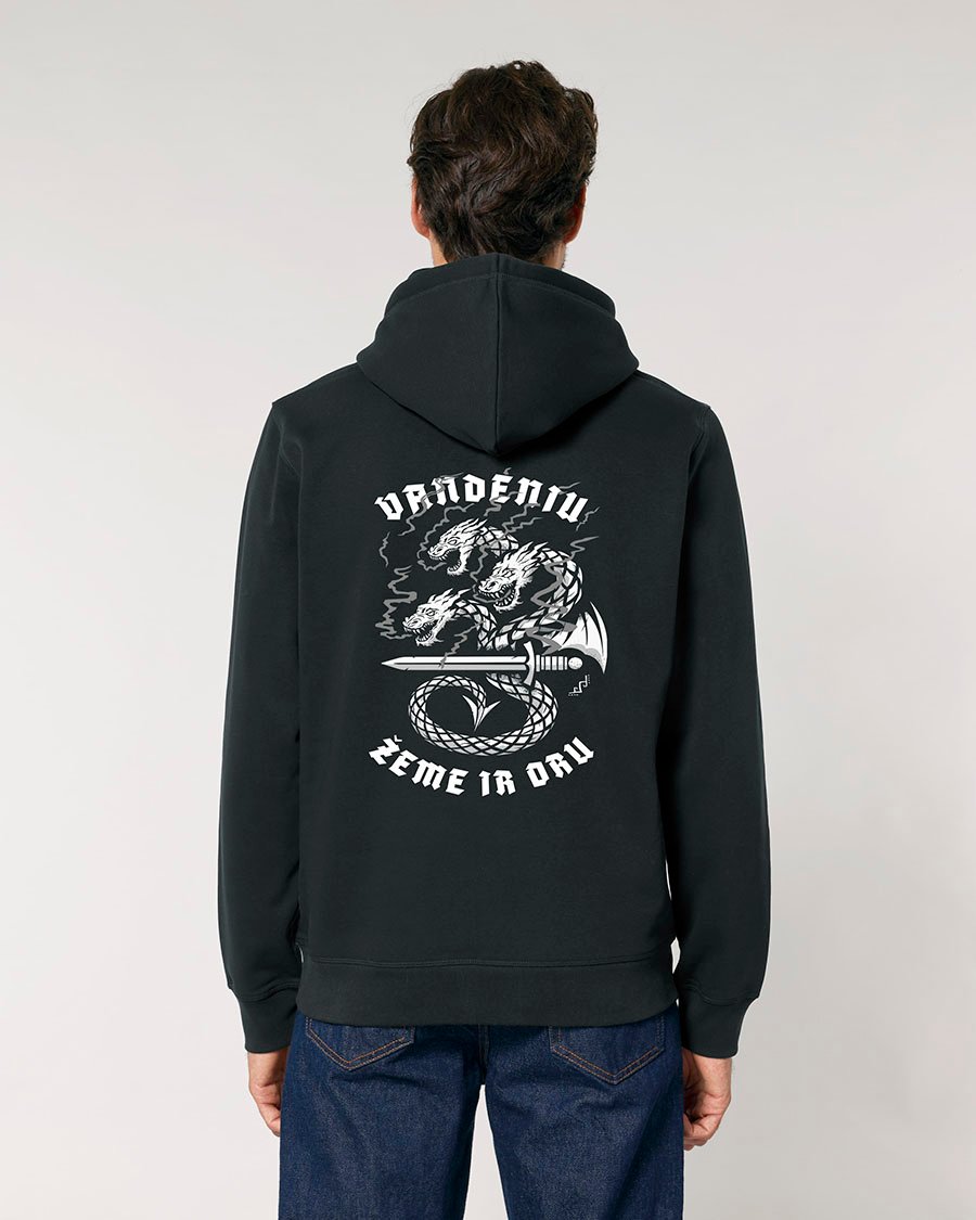 Išreikšk savo prigimtinę galią, baltų pasaulėjautą ir kario dvasią su išskirtiniu PAGAN™ džemperiu su kapišonu „Vandeniu, žeme ir oru“. Šis dizainas įkvėptas Lietuvos kariuomenės Dragūnų bataliono simbolikos ir sukurtas tiems, kurie vertina discipliną, ištvermę ir ryšį su savo žeme. Tai daugiau nei drabužis – tai pareiškimas apie tavo vertybes.
